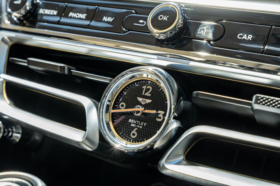 For example, the air vent controls are finished in knurled metal rather than plastic, while there’s soft suede to be found overhead. A Bentley-branded analogue clock takes pride of place in the middle of the centre stack.