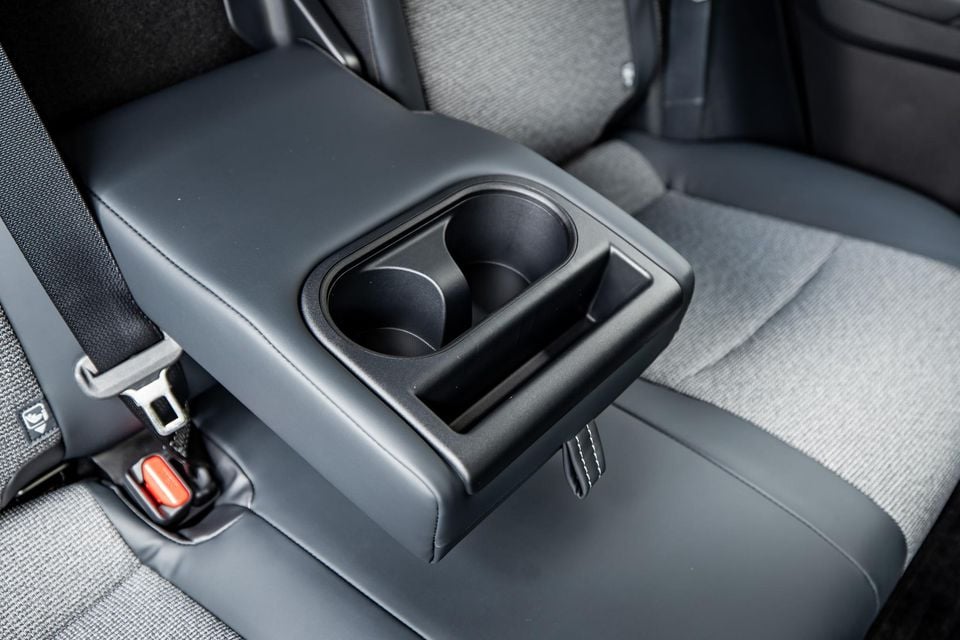 Drink storage is well considered, with cup holsters between the seats, and there are bottle holders in the doors, though those pocket sections aren’t lined. Between the seats is a centre console bin with a dual-directional lid – meaning it can open towards the passenger or away from them.